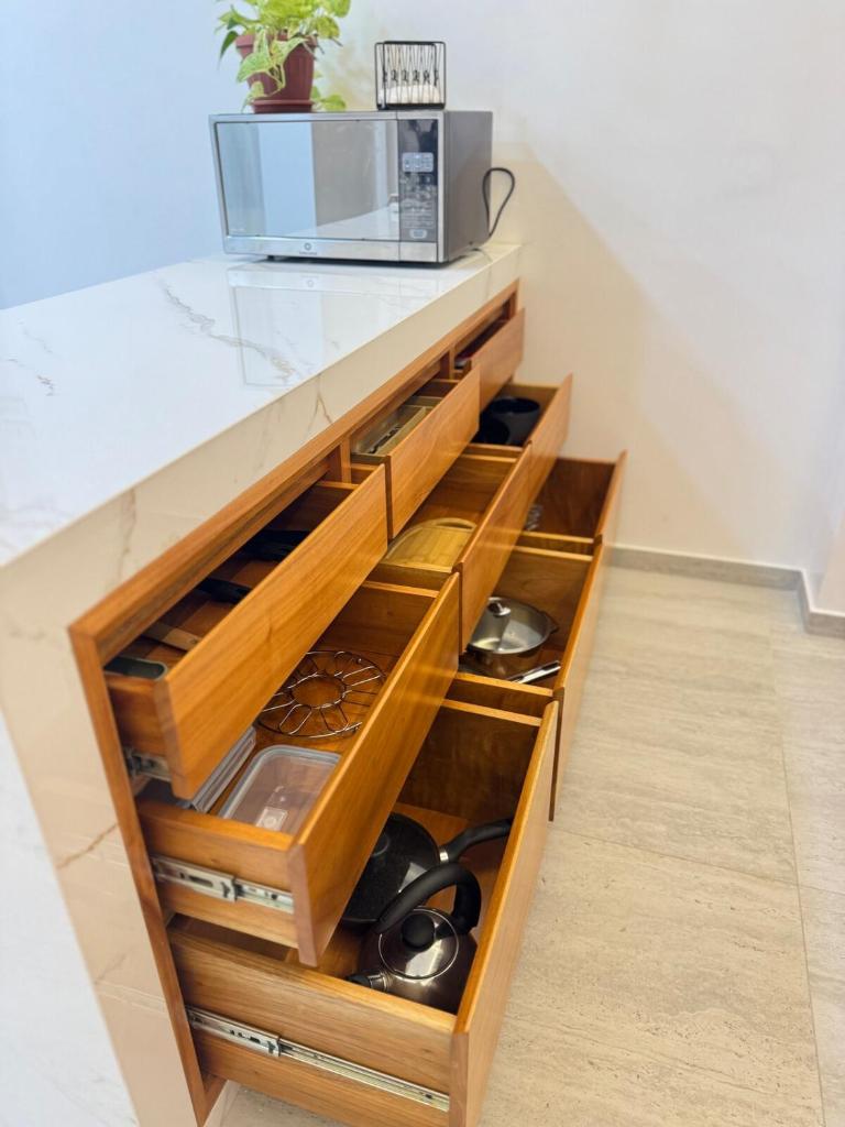 Two-Bedroom Deluxe Apartment. Boasting a private entrance, this air-conditioned apartment includes 1 living room, 2 separate bedrooms and 1 bathroom with a shower and a hairdryer. A kitchen fitted with a refrigerator, kitchenware and a microwave is available for cooking and storing food. The apartment offers a flat-screen TV with cable channels, a coffee machine, a seating area, a wardrobe as well as ancourtyard view. The unit has 3 beds.